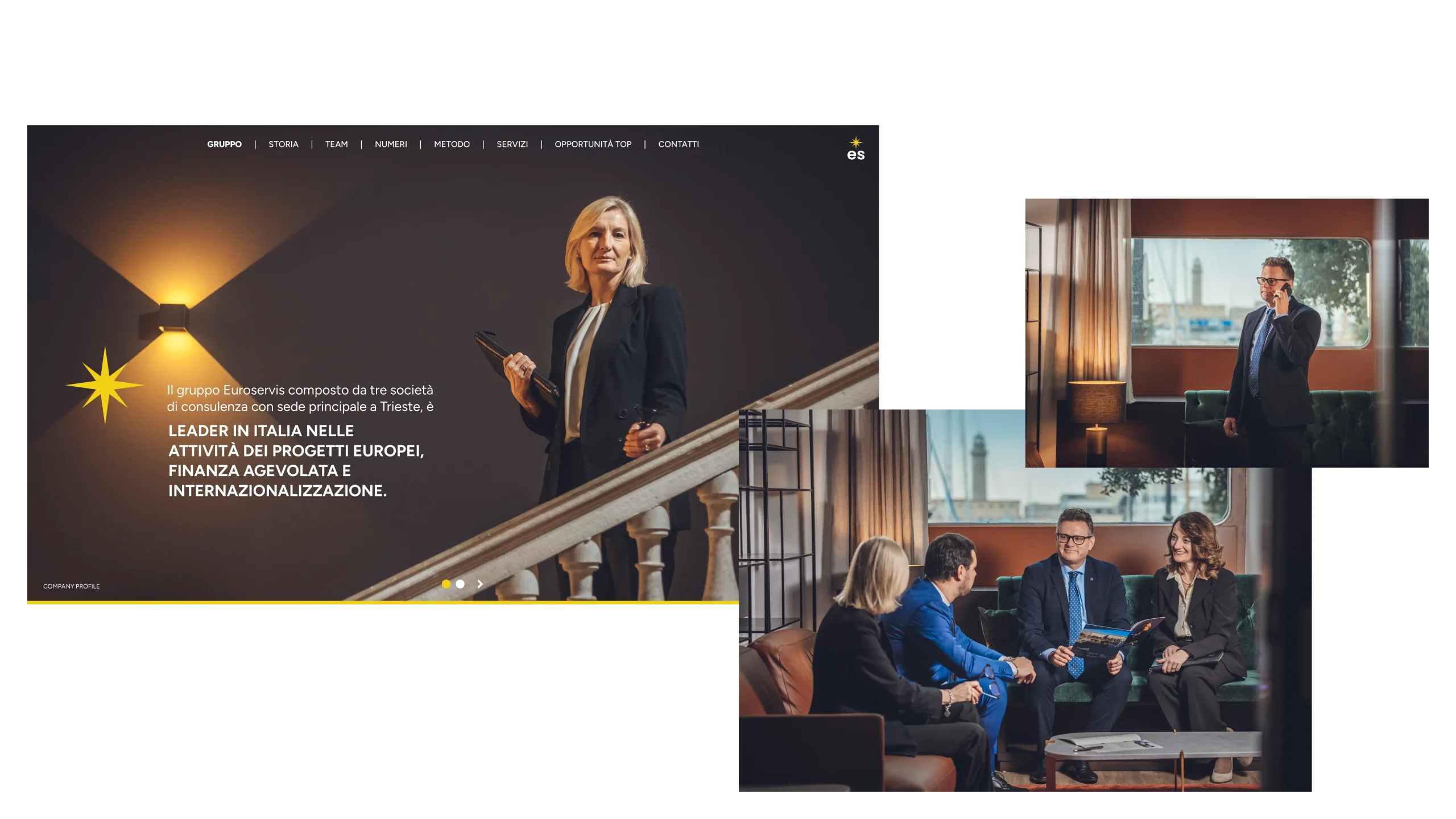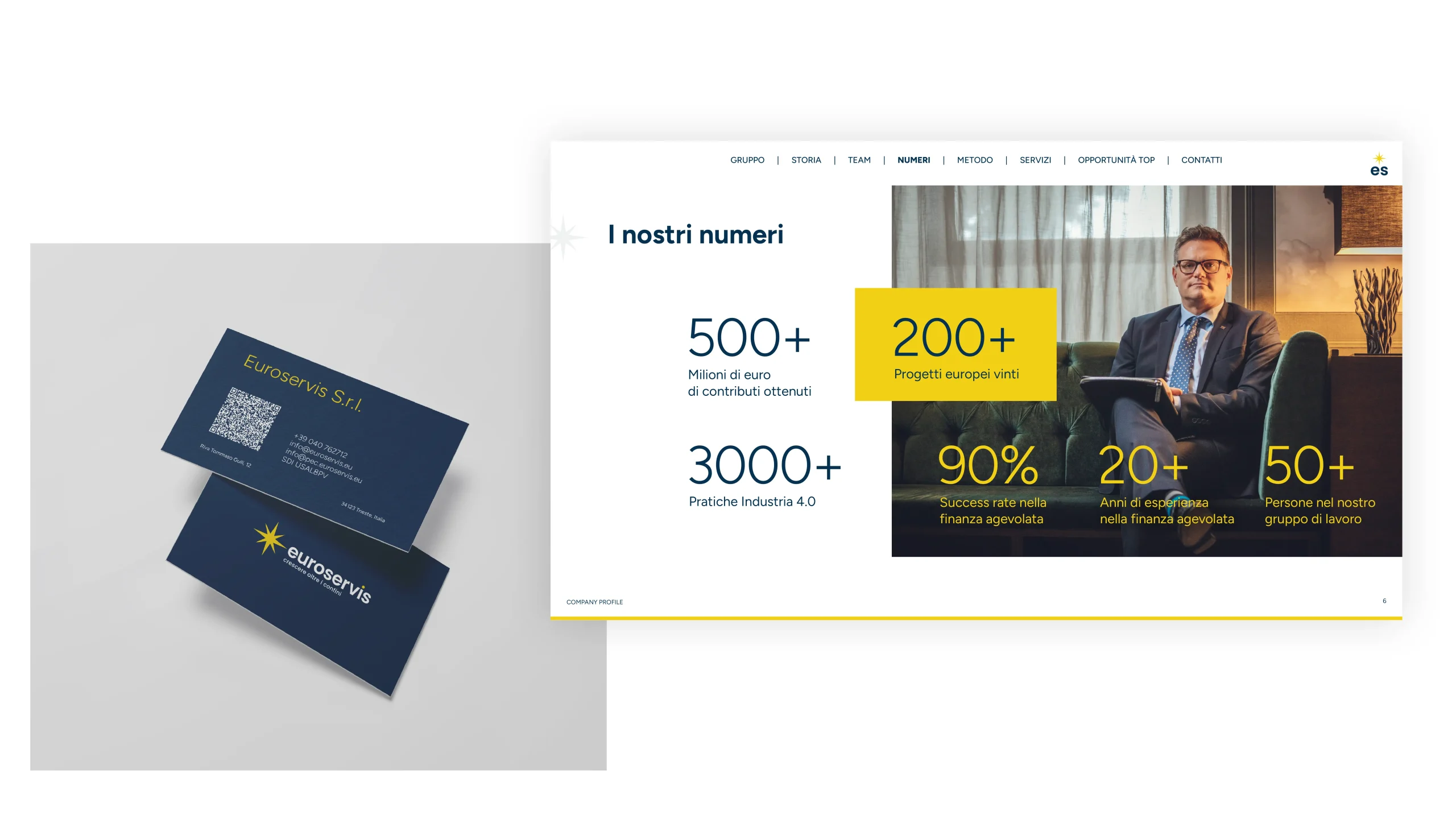 Abbiamo ridisegnato da zero la loro identità visiva. Il logo precedente, con le cinque stelle a richiamo europeo, lasciava poco spazio all’unicità. Così è nata l’idea di una rosa dei venti, simbolo che comunica direzione, guida e apertura ai territori di confine. Un segno che non solo rappresenta l’azienda con sede a Trieste e la sua vocazione europea, ma che trasmette autorevolezza, dinamismo e un senso chiaro di orientamento. Intorno a questo concept abbiamo costruito tutta l’immagine coordinata: pulita, essenziale, solida. Ogni elemento – brochure, biglietti da visita, presentazioni – parla lo stesso linguaggio, semplice e diretto, ma ricco di significato.